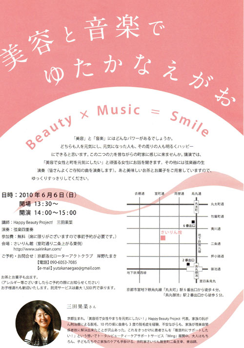 BEAUTY & MUSIC=SMILE 2022.06.25 2010年6月6日(日)午後13:30受付 14:00開演さいりん館(室町通り二条上る東側)にて「美容と音楽でゆたかなえがお」と題して三田果菜さんの講演とHappyBeautyProjectによる管弦楽演奏会が開催されます。入場無料でお菓子とお茶も出ます。事前予約が必要です。ご予約お問い合わせ先:京都洛北ローターアクトクラブ岸野さんまでお願いします。
